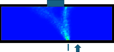 解析例:地表に高架橋橋脚に相当する重量物(上図の長方形)がある場合に、地盤の下部で上向きの断層変位(上図縦線を境に右側を矢印方向に変位)を加えた際に、地盤内でひずみが大きくなる領域の分布(上図緑色の領域)